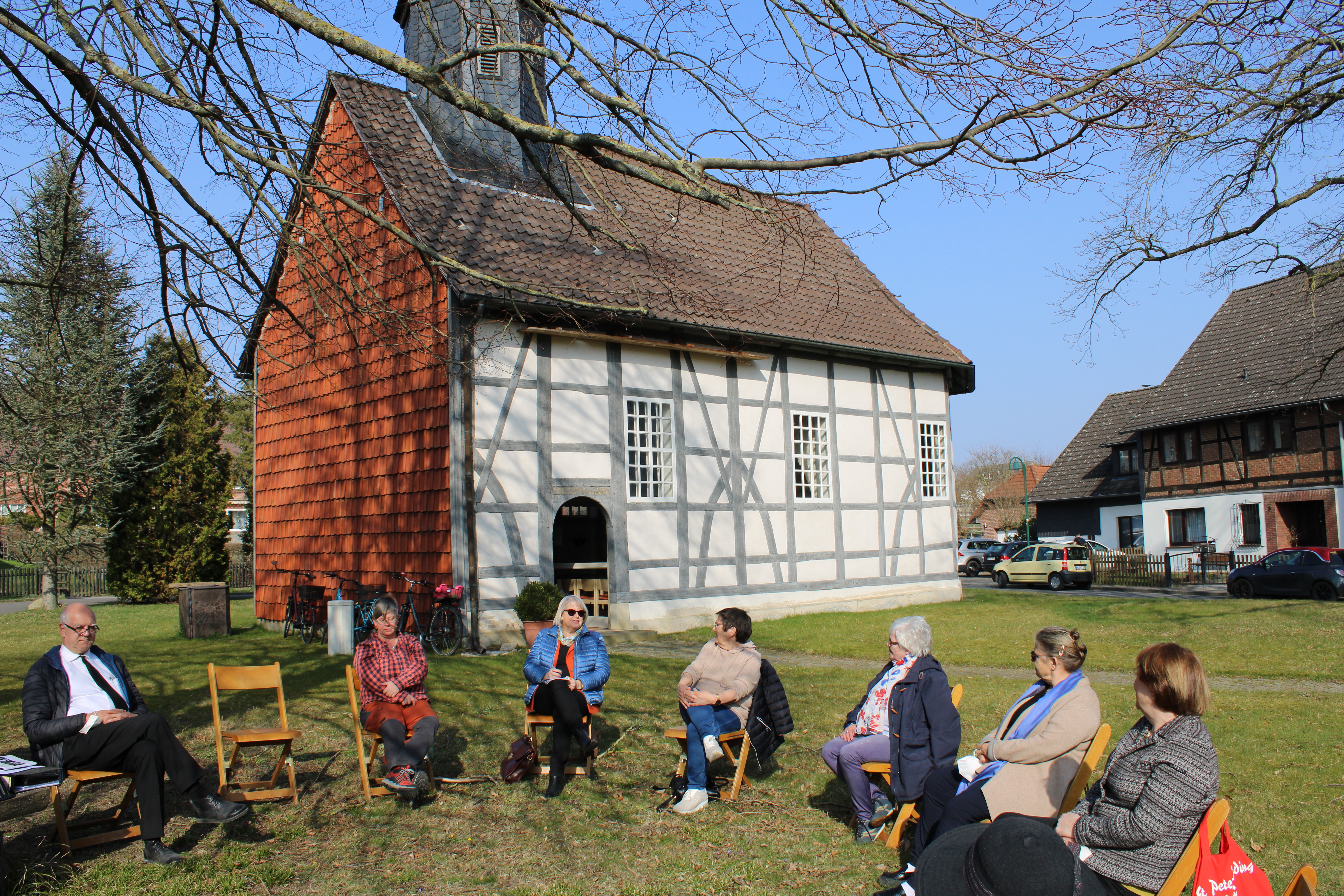 Glücklicherweise kann die evangelische Kirche im Raum Holle auf eine große Anzahl ehrenamtlich engagierter Menschen setzen, was beim Besuch von Katharina Henking in Luttrum deutlich wurde. Bevor sie dort bei schönstem Wetter draußen vor der Annen-Kapelle mit den leitenden Köpfen der Besuchsdienstkreise ins Gespräch kam, warf die Superintendentin einen Blick in die Kirche mit ihren 14 Deckenmedaillons aus dem Jahr 1716. „Dies ist ein ganz besonderes historisches Gotteshaus und zeugt mit seiner Kirchenstiftung von der Nähe zur Gemeinde“, sagte Katharina Henking.