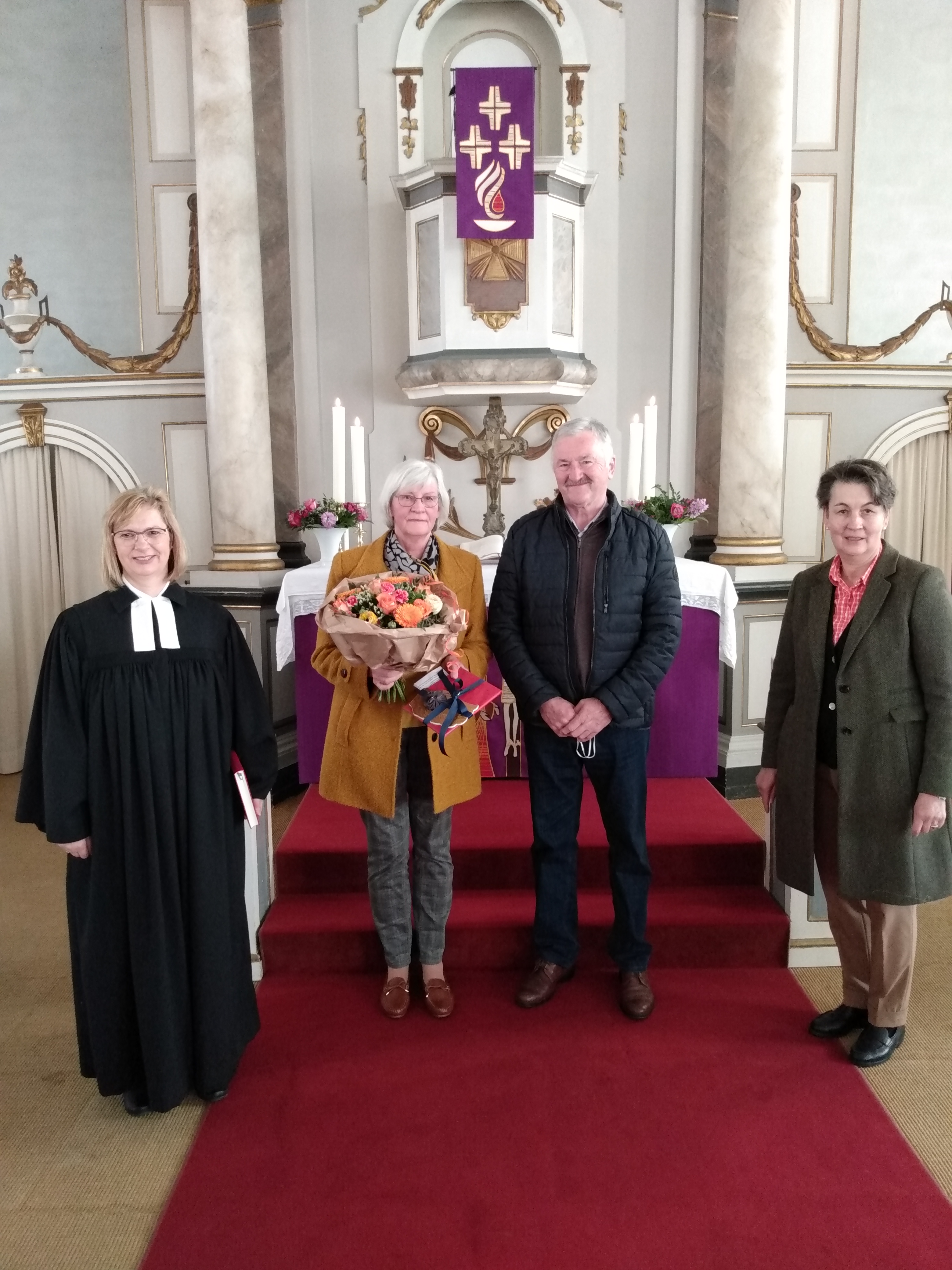 Die Augen der Besucher des Visitationsgottesdienstes am Okuli-Sonntag waren aber auch auf auf Doris Neise gerichtet. Sie wurde nach 22-jähriger Dienstzeit als Pfarrsekretärin in den Ruhestand verabschiedet. „In dieser Zeit war sie Ansprechpartnerein für insgesamt fünf Pastoren, vier Kirchenvorstände und alle Gemeindeglieder,“ steckte Susanne Block-Gruppe den vielköpfigen Personenkreis ab, für den Doris Neise in ihrer Amtszeit stets ein offenes Ohr gehabt habe. Die immer anspruchsvolleren Aufgaben habe sie stets mit großer Gelassenheit – auch aufgrund ihrer Erfahrung – und mit großer Freundlichkeit den Menschen gegenüber bewältigt. Flexibel und ausdauernd sei sie selbst den Herausforderungen des Dienstcomputers begegnet. „Du bist mit dem Amt und seinen Aufgaben gewachsen,“ bescheinigte die Kirchenvorstands-Vorsitzende der langjährigen Pfarrsekretärin.