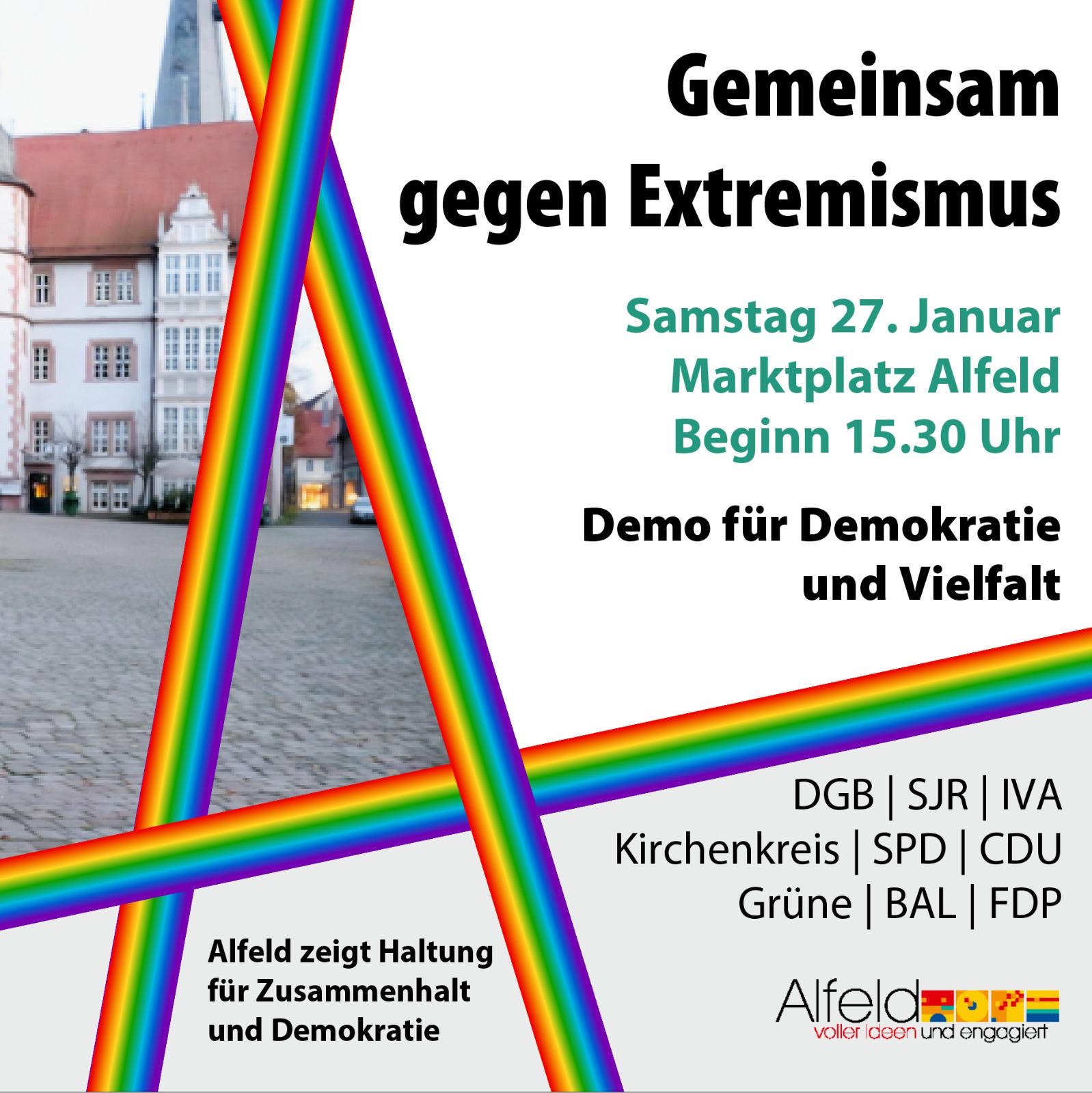 Ein Bündnis unter Beteiligung des Deutschen Gewerkschaftsbundes (DGB), des Stadtjugendringes Alfeld e.V., des Industrievereins Alfeld, der evangelischen und katholischen Kirche, sowie aller im Rat der Stadt Alfeld (Leine) vertretenen Parteien und Verbände wird am Samstag, 27. Januar, ab 15.30 Uhr auf dem Marktplatz der Stadt Alfeld eine stationäre Demonstration für Demokratie und Vielfalt abhalten.