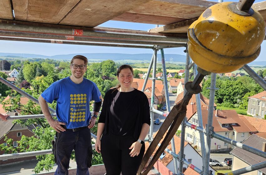 Mehle. Pastorin Debora Becker ist an diesem Tag dem Himmel so nah. Sie steht in rund 25 Meter Höhe auf dem Baugerüst des Kirchturms und genießt den Blick auf das Dorf und die Umgebung. Eigentlich ...