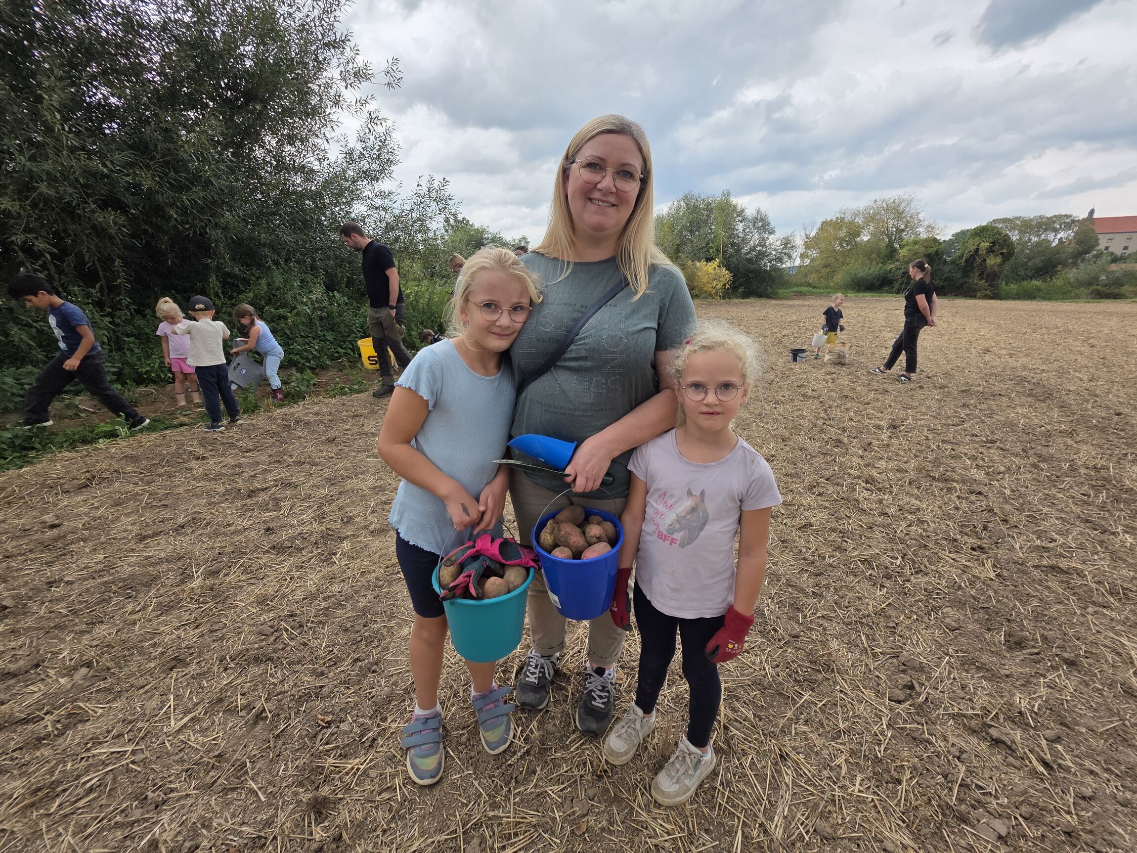 Mit dabei waren an diesem Tag auch Juliane Kiß mit ihren Töchtern Marlene und Emilia. „Das ist eine klasse Aktion“, sagte Kiß, deren älteste Tochter Emilia sich schon auf Kartoffelbrei aus den gesammelten Erdäpfeln freute. Nach dem Aufsammeln der gerodeten Kartoffeln stärkten sich alle Beteiligten noch beim gemeinsamen Pommesessen.