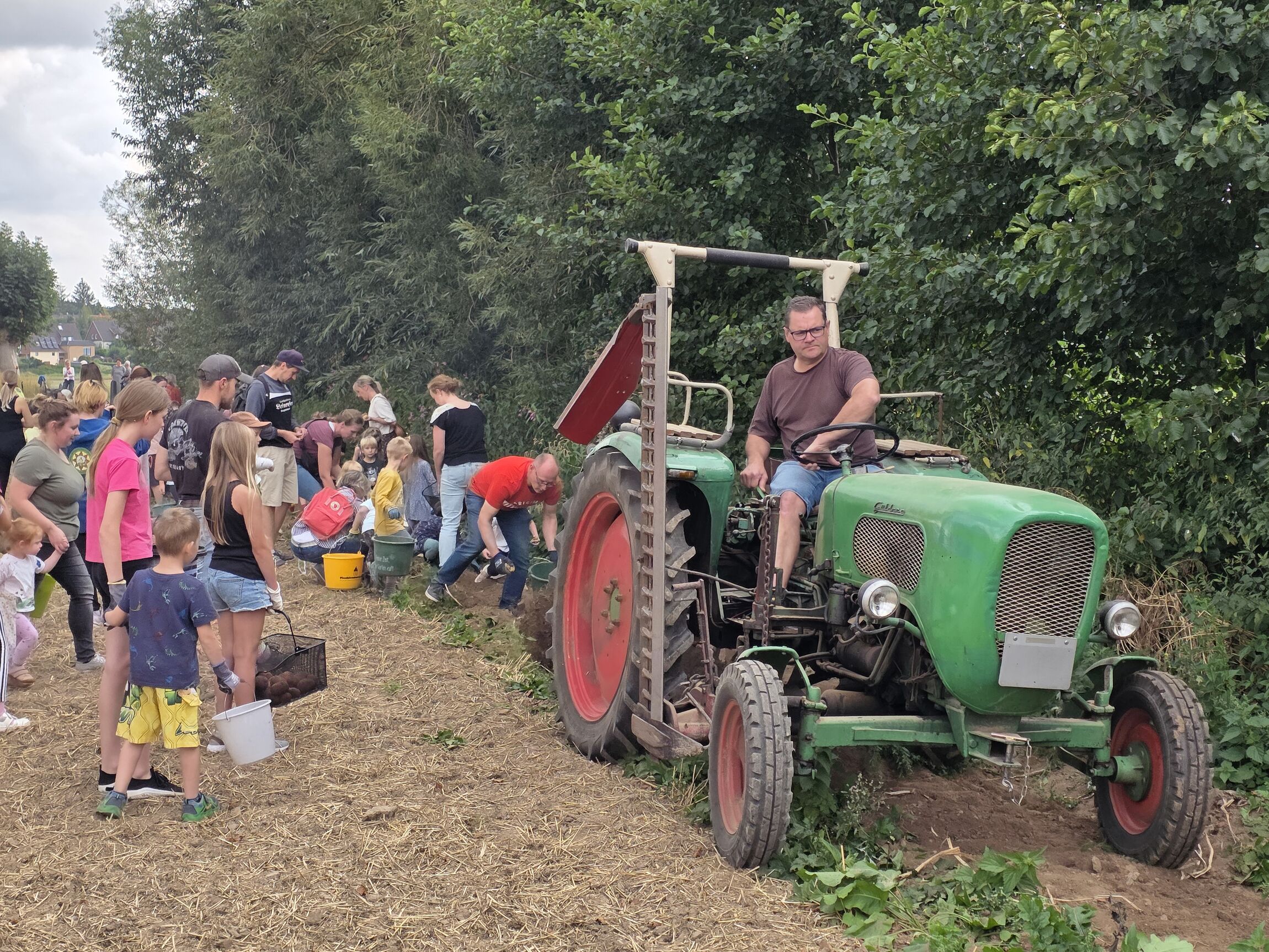 Beim Aufsammeln der Kartoffeln hinter dem Trecker hatten Kinder und Eltern viel Spaß. Foto: Thomas Schlenz
