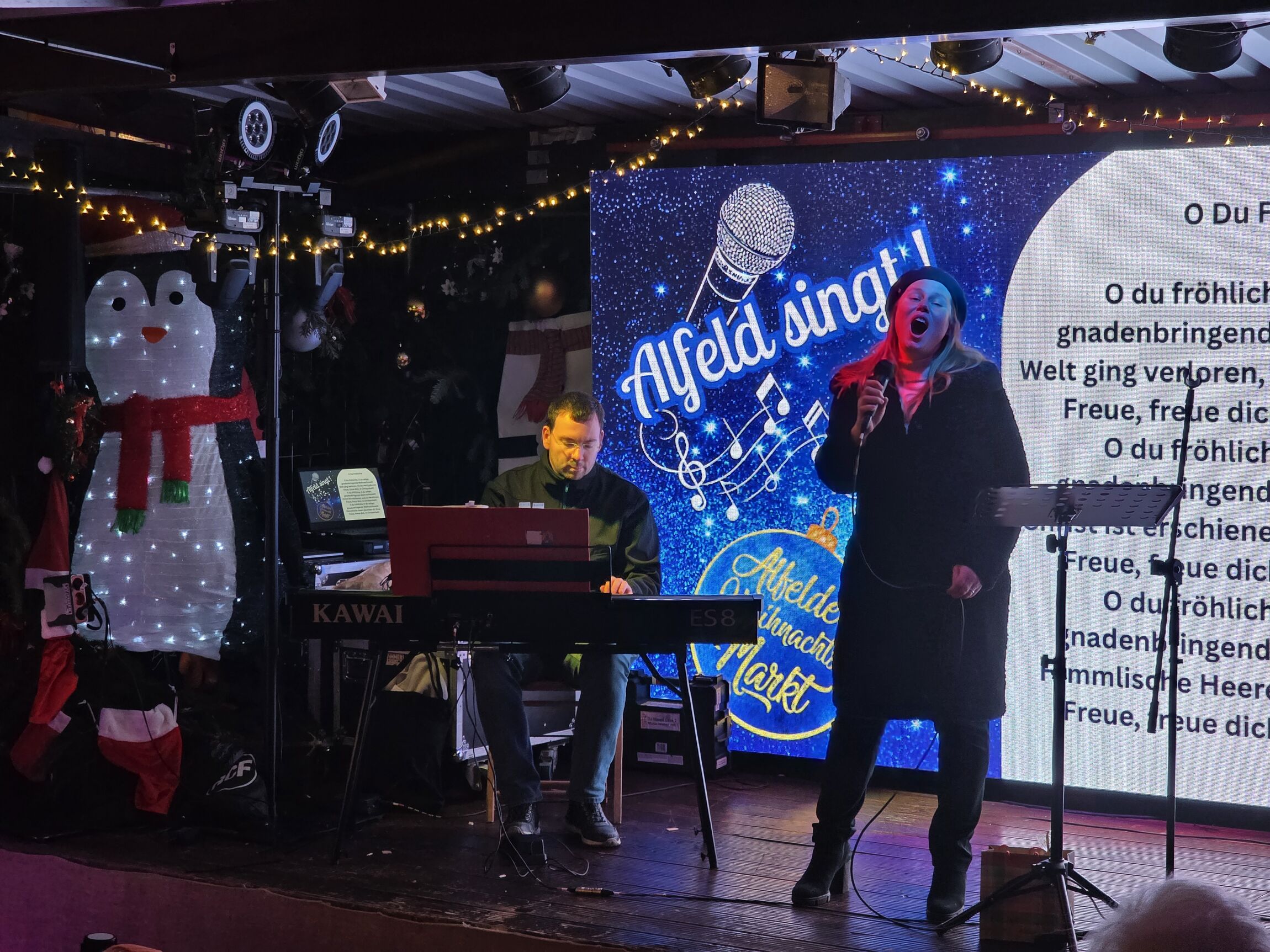 Alfeld - Ohne Weihnachtslieder wäre die Adventszeit nur halb so schön. So nutzten viele Besucher:innen des Alfelder Weihnachtsmarktes bei „Alfeld singt!“ kürzlich die Gelegenheit zum Mitsingen, als Popkantorin Hanna Jursch begleitet von Kreiskantor Tobias Langwisch gleich mehrere Weihnachtsklassiker anstimmte. Nach der Anmoderation von „DJ Elch“ erklang eine halbe Stunde lang von „Fröhliche Weihnacht überall!“ und „Leise rieselt der Schnee“ bis hin zu Rolf Zuckowskis „In der Weihnachtsbäckerei“ eine bunte Mischung an Weihnachtsliedern. Auch wer nicht so textsicher war, konnte dank Liedzetteln und Leinwand ohne Probleme mit einstimmen. Auch Alfelds neuer Superintendent André Dittmann war an diesem Abend zum gemeinsamen Singen gekommen. Die Gäste des Weihnachtsmarktes hörten gebannt zu, als er einen kurzen Auszug aus der weihnachtlichen Geschichte „Der kleine Straßenfeger und das Engelshaar“ von Christiane Windhausen vorlas.