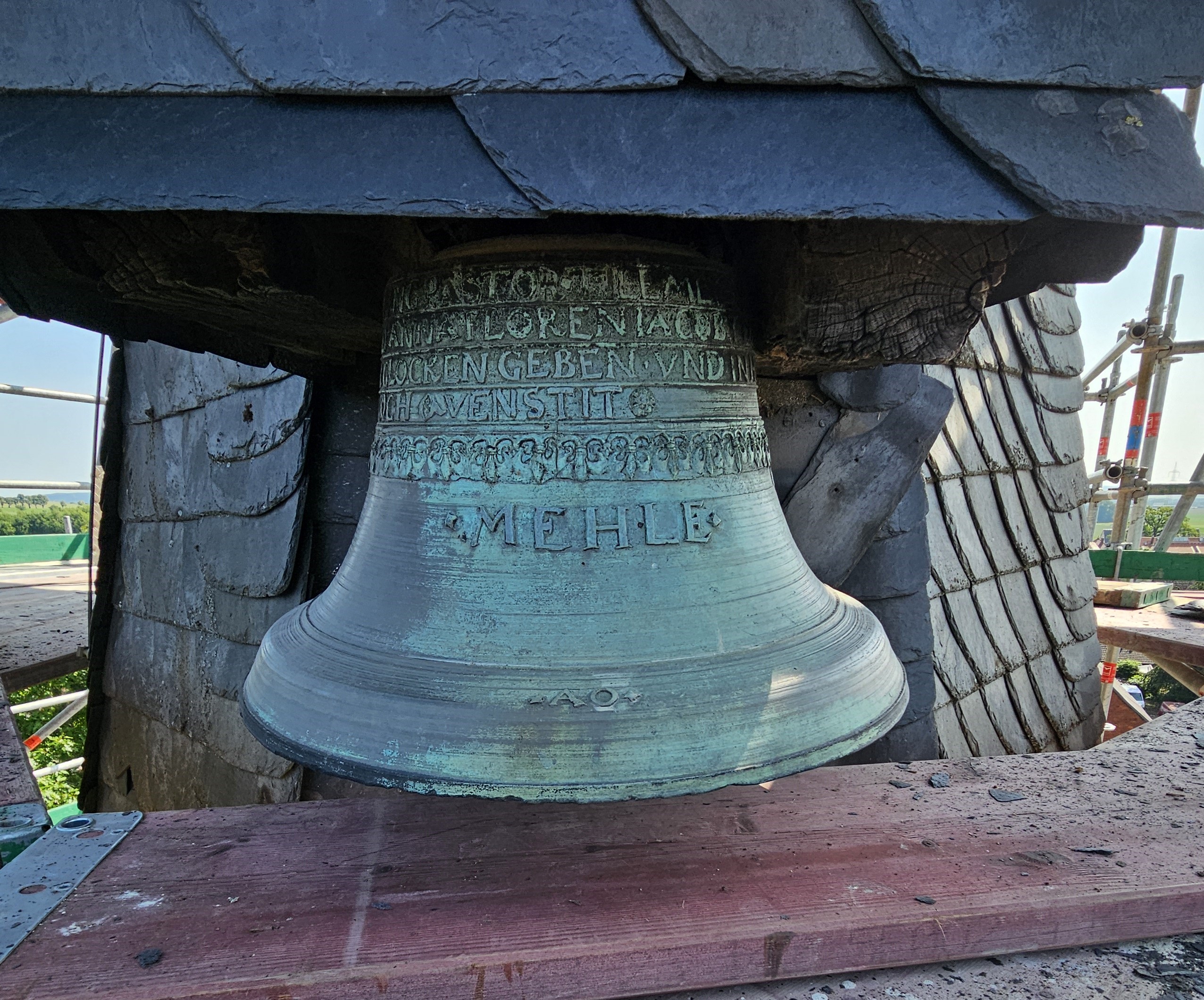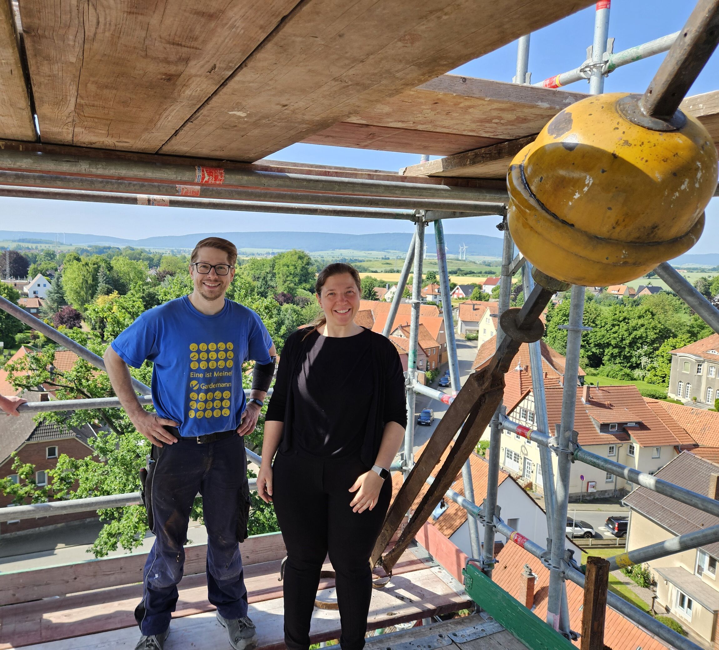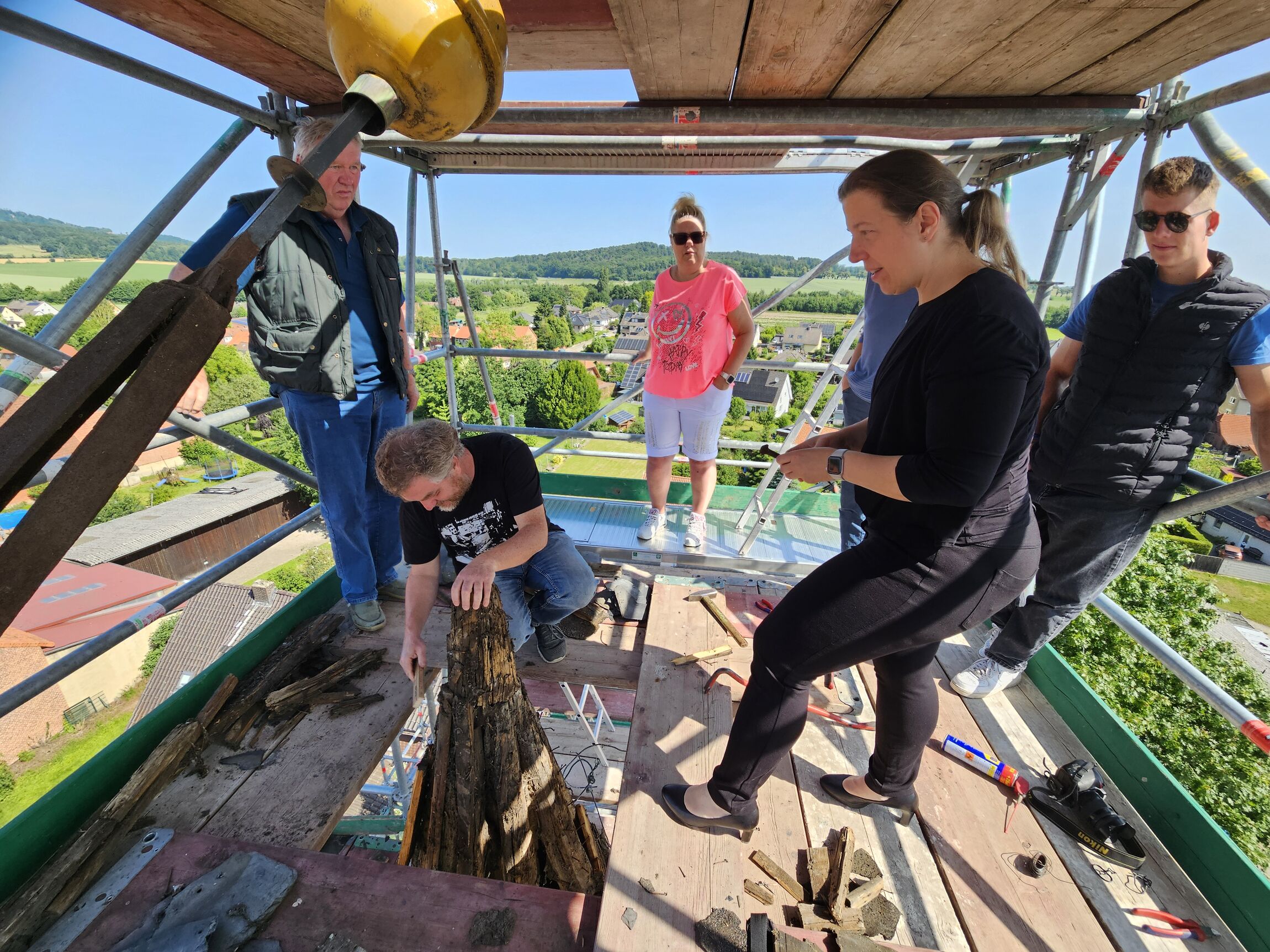 Mehle. Pastorin Debora Becker ist an diesem Tag dem Himmel so nah. Sie steht in rund 25 Meter Höhe auf dem Baugerüst des Kirchturms und genießt den Blick auf das Dorf und die Umgebung. Eigentlich sollte heute die Zeitkapsel an der Spitze des Turms geöffnet werden, doch die gelbe Bleikuppel ist festgerostet, ein Öffnen an Ort und Stelle ist nicht möglich. „Ich war so gespannt, was wir im Inneren finden werden“, sagt die Pastorin. Sie muss sich nun noch ein paar Tage gedulden, bis Restaurator Dirk Zeyher die Kuppel in seiner Hildesheimer Werkstatt öffnen und den Inhalt der Kapsel aus dem Jahr 1966 ans Tageslicht befördern kann. Anschließend soll sie mit Zeitdokumenten und aktuellen Fotos von Mehle für nachfolgende Generationen wieder verschlossen werden.