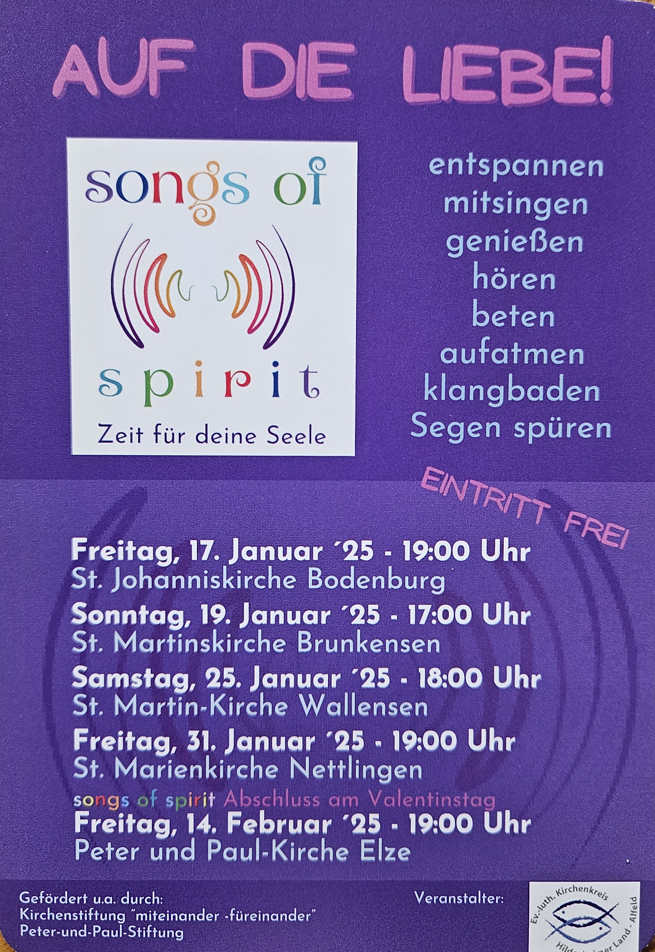 Unter der Leitung von Popkantorin Hanna Jursch und Kirchenmusikdirektor i.R. Wolfgang Teichmann spannt „songs of spirit 2025“ einen musikalischen Bogen von neuen geistlichen Liedern, sogenannten meditativen Circle-und Healing-Songs bis zu Pop- und Instrumentalstücken. Zusammen mit den Besucherinnen und Besuchern, einer professionellen Bandformation und einem Projektchor für den abschließenden Abend in Elze sowie durch Mitgestaltende vor Ort solle ein intensiv erlebbarer Klang-Raum geschaffen werden. So entstehe viel Platz, um zur Ruhe zu kommen, für Dank und Bitte, zum Träumen und Bewegen und ebenso für persönliche Segnung.