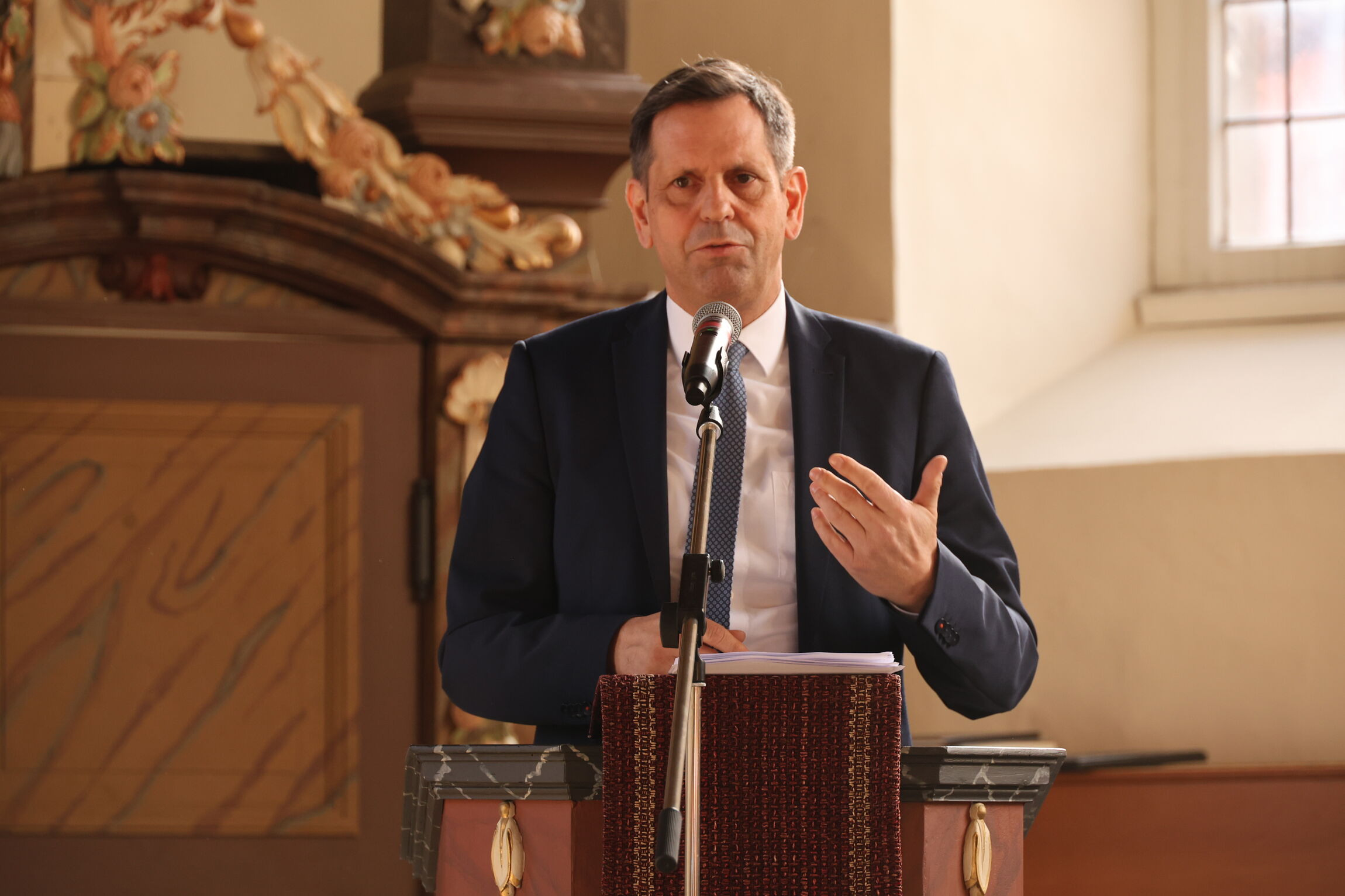Glaube könne verbinden, betonte Lies. Kirche gehöre zu den großen Wertegemeinschaften und müsse sich einmischen – mit Nächstenliebe und Verantwortung. „Ich erwarte, dass sich Kirche einmischt“, sagte er deutlich. Kirche beziehe außerdem klar Stellung gegen Hass und Hetze. Das sei vorbildlich. Besonders würdigte er die Fastenaktion „7 Wochen ohne“ und das erweiterte Motto „7 Wochen ohne Härte“. In Anlehnung an das Chanson „Ermutigung“ von Wolf Biermann zitierte er: „Du lass dich nicht verhärten.“ Gerade in harten Zeiten dürfe man selbst nicht hart werden, so Lies.