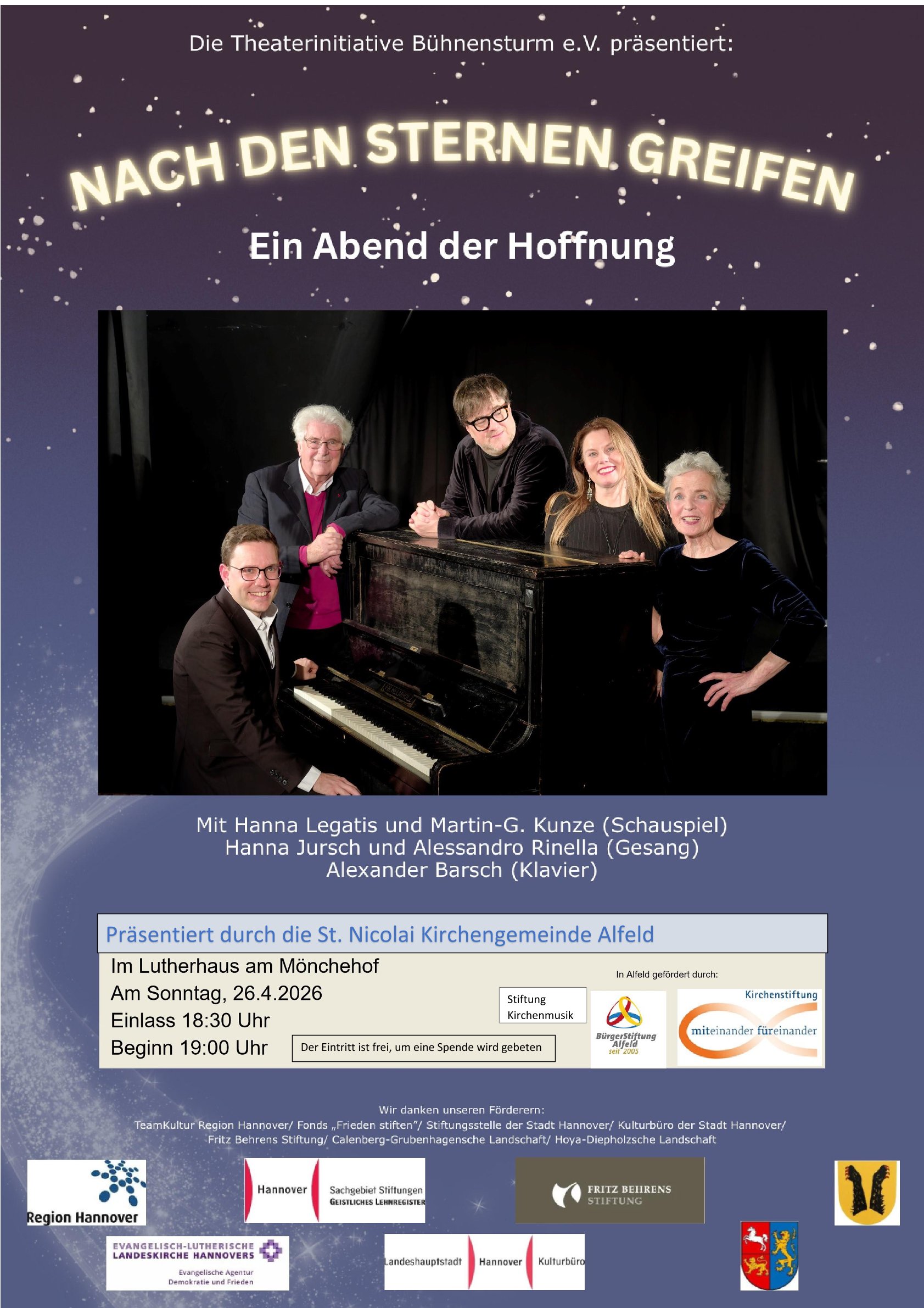 Alfeld - Jazz trifft Klassik, Latin begegnet Swing – ironisch, feinsinnig und hintergründig. Ergänzt durch Texte, Gedichte und kurze komödiantische Szenen entsteht ein facettenreiches Bühnenprogramm, das mutig nach den Sternen greift und vor allem eines macht: Hoffnung.