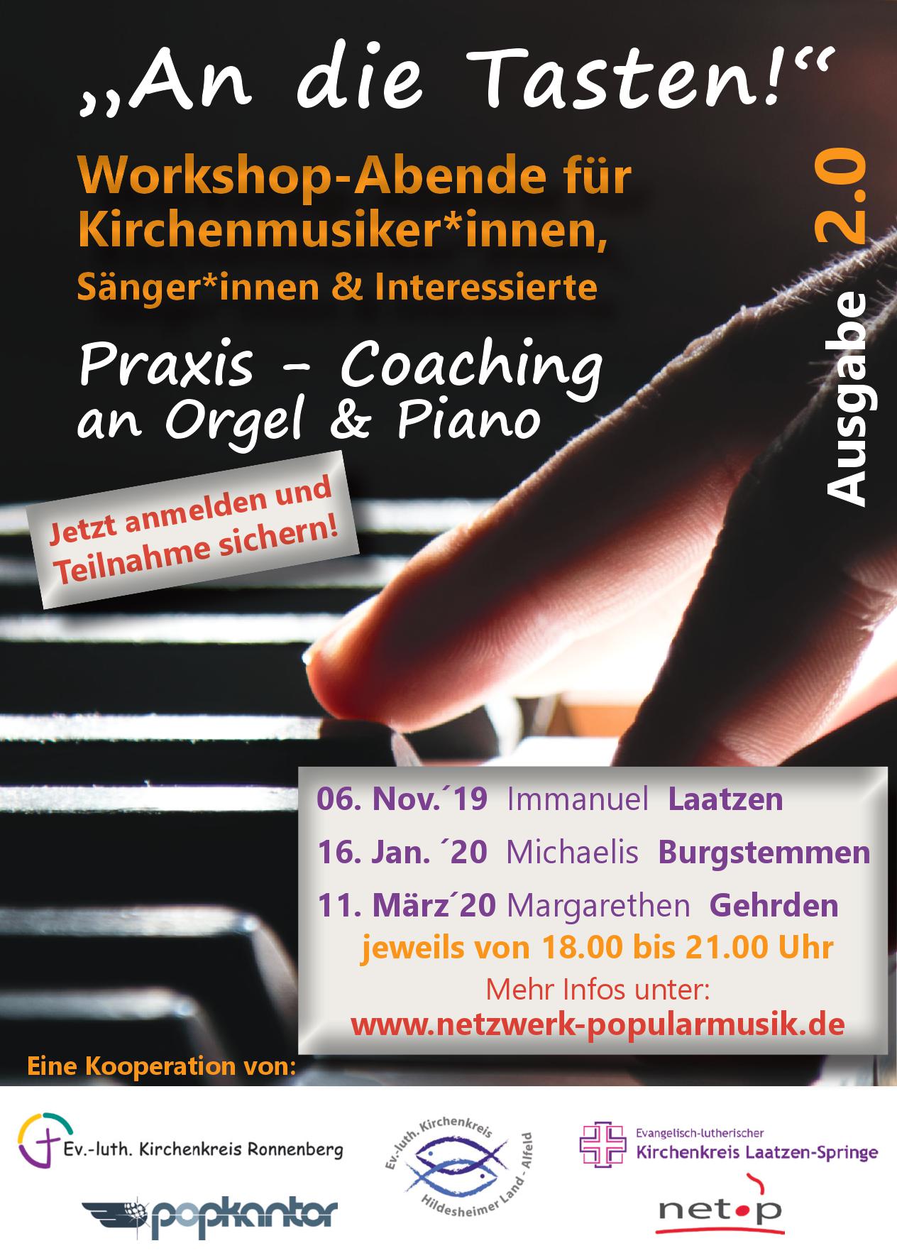 Burgstemmen. „An die Tasten“ lautet das Motto der drei Workshop-Abende des Netzwerks Popularmusik für Kirchenmusiker, Sänger und Interessierte. Als Referenten konnten Til von Dombois, Popkantor in der Landeskirche Hannover, Claus Feldmann, Pianist und Gospelbandleader aus Gehrden, Bettina Gilbert, Kirchenmusikdirektorin aus Hildesheim, der Pianist Andreas Hülsemann aus Hemmingen sowie Zoltán Suhó-Wittenberg, Kirchenkreiskantor aus Laatzen, gewonnen werden. Aus den Workshop-Angeboten „Die kleine Piano-Band“, Liedbegleitung im Zusammenspiel mit Cajón und Lead-Sängern, „Populäre Stilmittel auf der Orgel“ und „Pop-Piano im Gottesdienst“ können die Teilnehmer jeweils zwei auswählen. Die Reihe beginnt am Mittwoch, 6. November, in der Immanuel-Kirche in Laatzen, wird am Donnerstag, 16. Januar, in der Michaelis-Kirche Burgstemmen fortgesetzt und endet am Donnerstag, 21. Mai, in der Margarethen-Kirche in Gehrden. Alle Workshops beginnen um 18 Uhr. Anmeldungen für das kostenlose Angebot mit Namen, Alter, Wohnort und dem gewünschten Termin per E-Mail an: info@netzwerk-popularmusik.de oder über den Link https://anmeldung.e-msz.de/node/1942 Peter Rütters